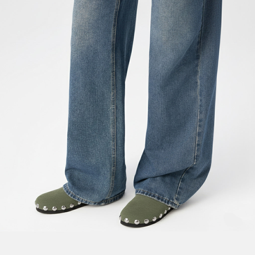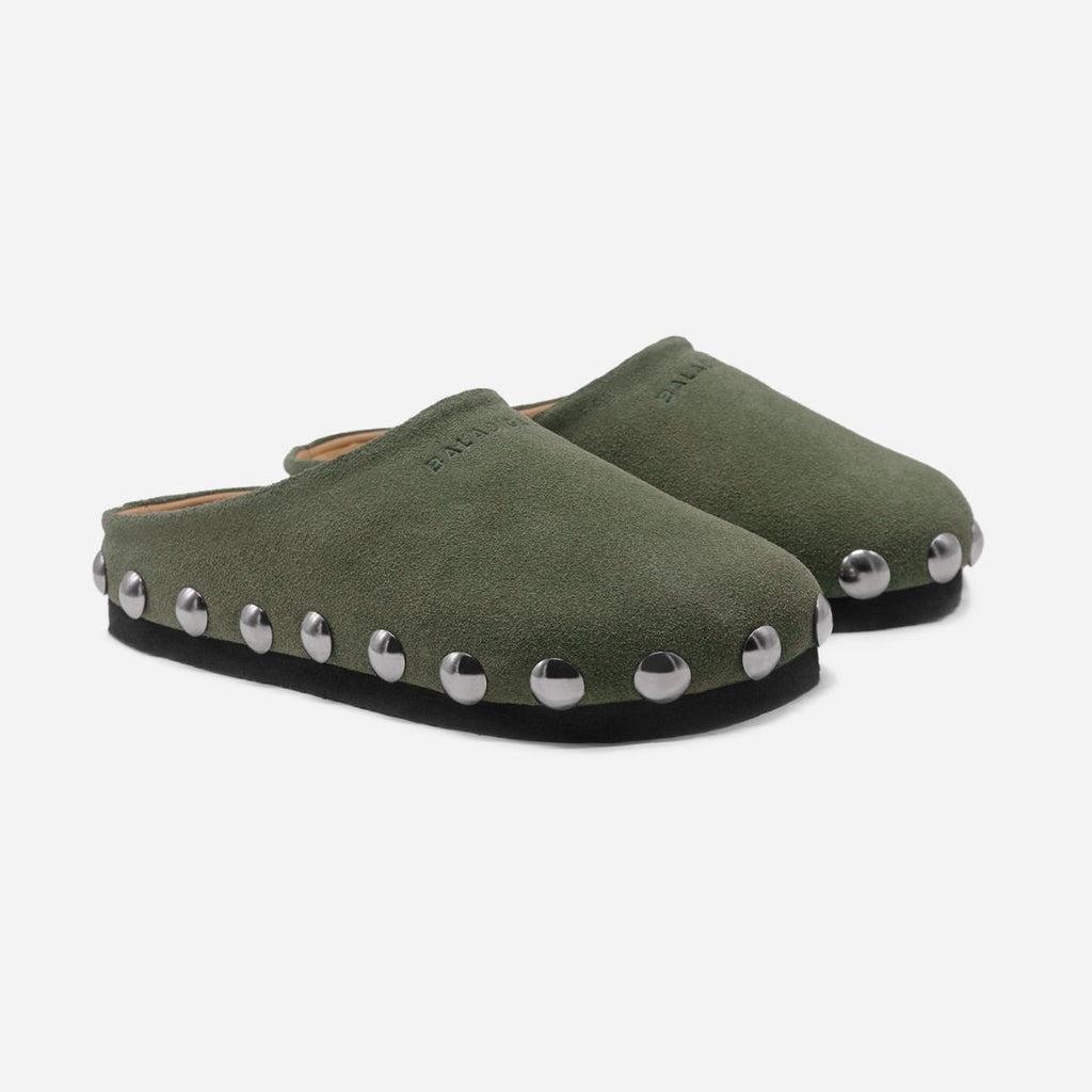 Zapato plano tipo zueco en color verde olivo. Con silueta atemporal y clásica, el logo de la marca sutilmente marcado a la altura del empeine y estoperoles con relieve en color plateado alrededor.