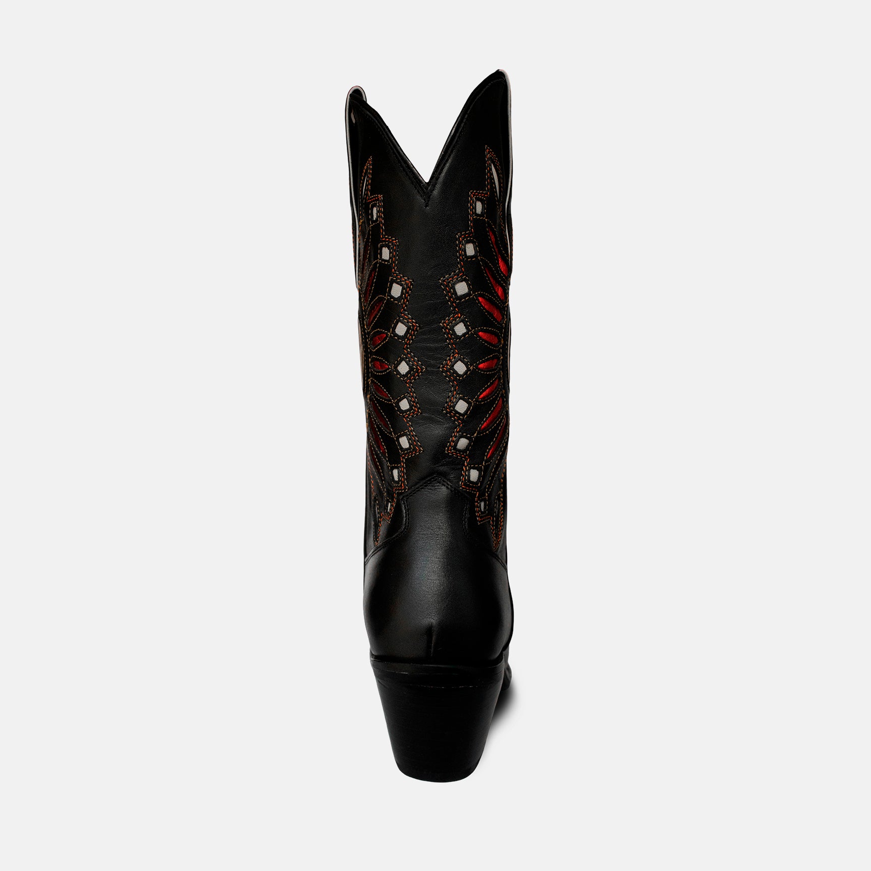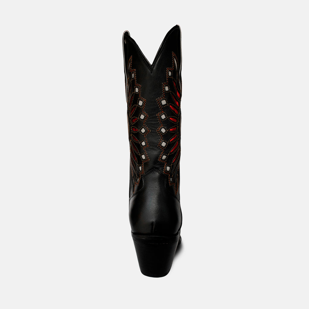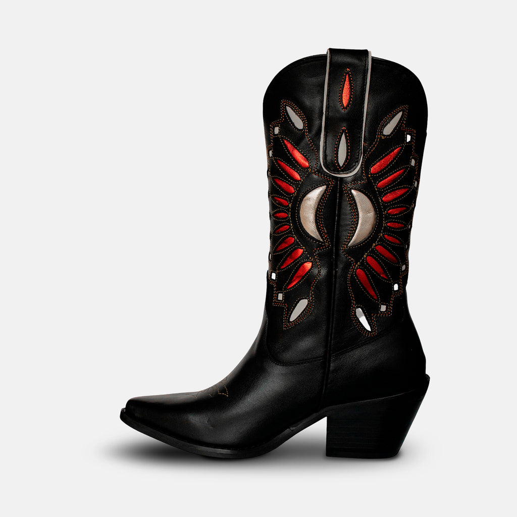 Un statement de fuerza y elegancia en piel color negro bordado western y detalles en color dorado, rojo y blanco, estoperoles y silueta que destaca.