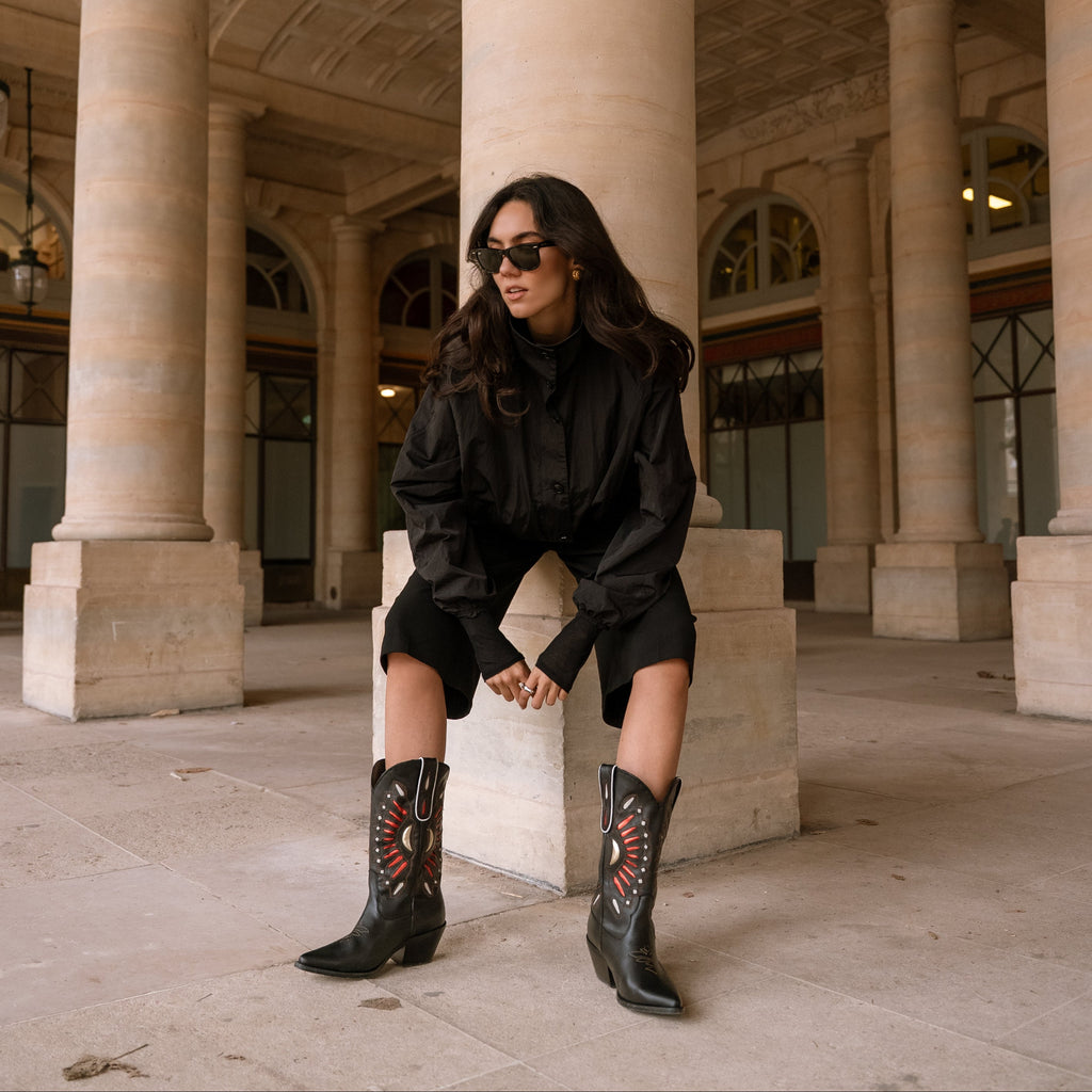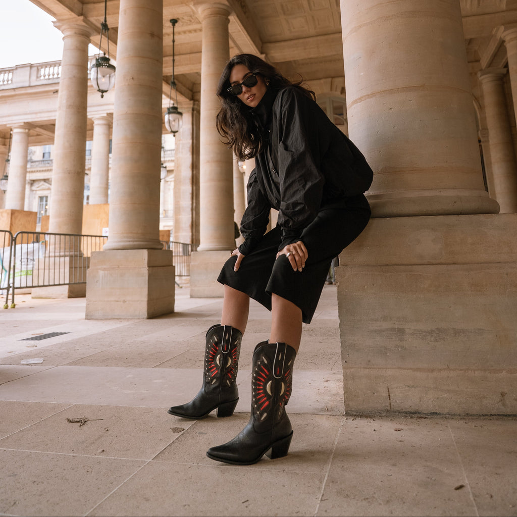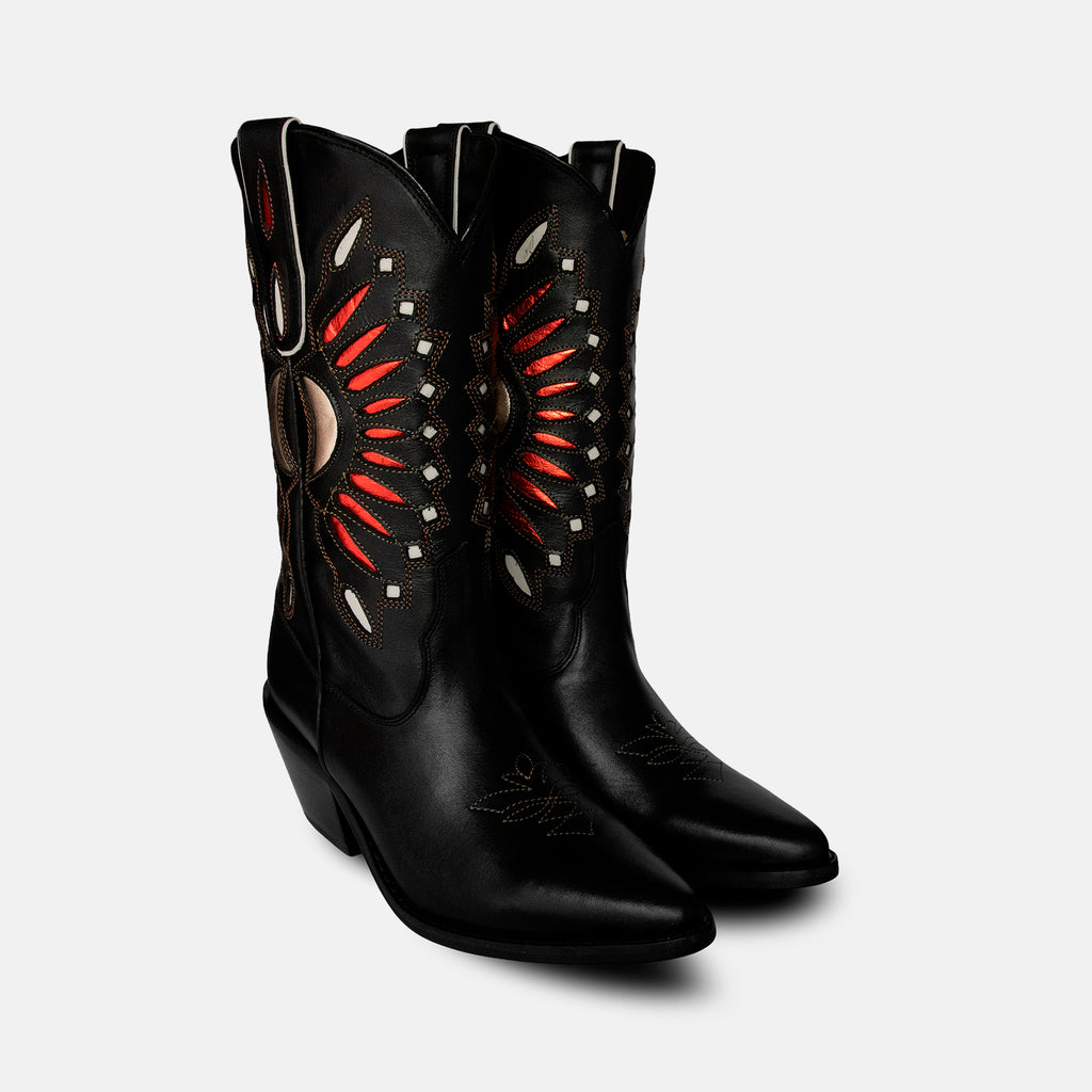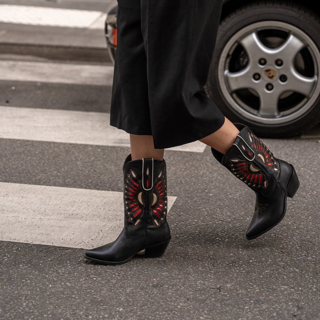 Un statement de fuerza y elegancia en piel color negro bordado western y detalles en color dorado, rojo y blanco, estoperoles y silueta que destaca.