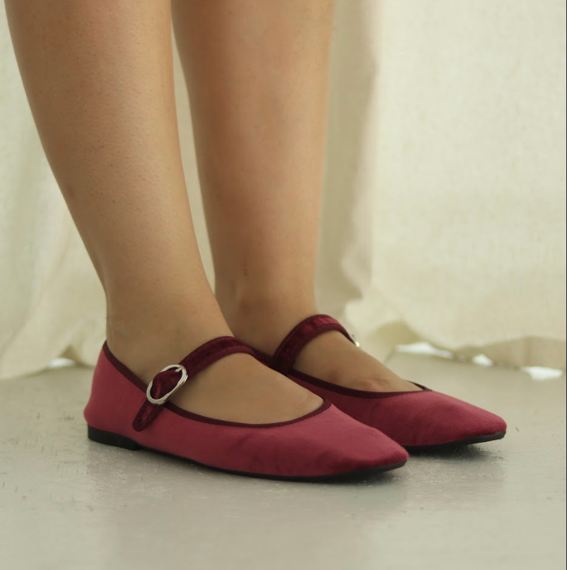 Ballerinas de terciopelo color rojo vino / borgoña con un aire romántico y sofisticado para el día a día. Diseño con tira ajustable y hebilla metálica.