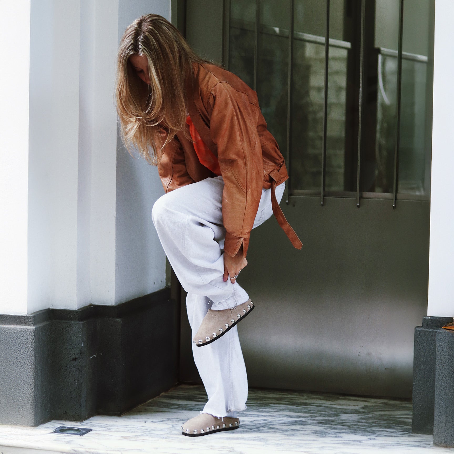 Zapato plano tipo zueco en color taupe / arena. Con silueta atemporal y clásica, el logo de la marca sutilmente marcado a la altura del empeine y estoperoles con relieve en color plateado alrededor.